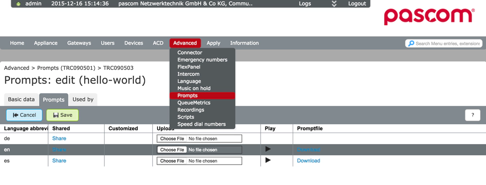 For companies with more budgetary constraints looking to improve their prompts and move away from any standard prompts their phone system may have, there is Audacity. We recently published a couple of tutorials on how to record your own custom prompts as part of our VoIP Guys Introducing Asterisk series. Part one is available here and part two here. Of course, Audacity will work with other phone systems as well, for example if I want to add a new prompt to our Asterisk based pascom phone system, I can record it, edit it and them upload it via the prompts menu as shown below.