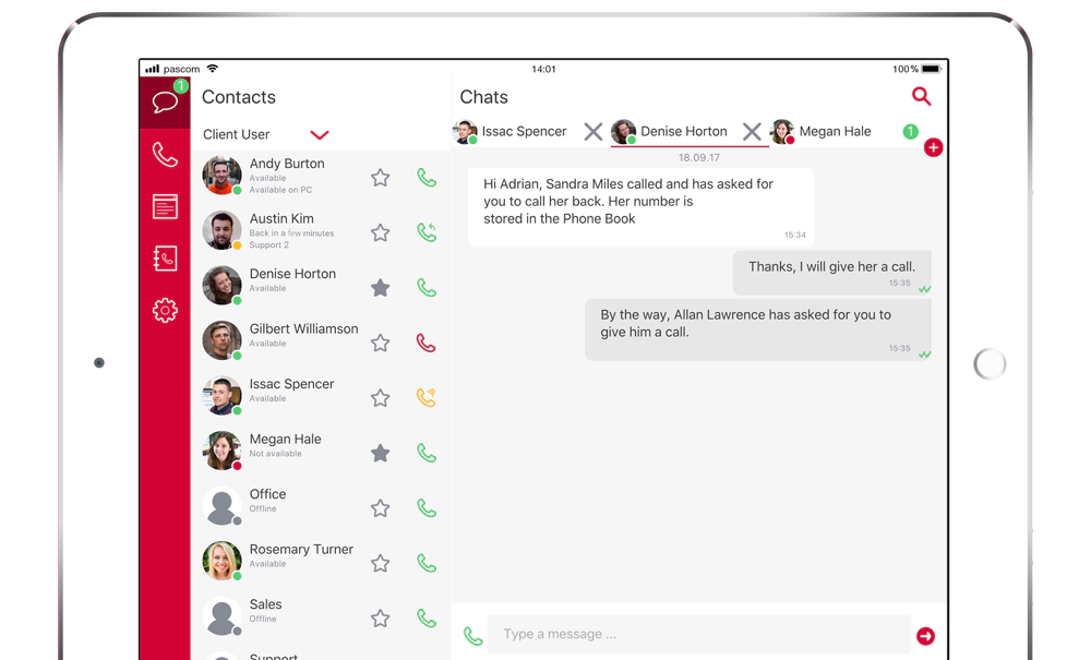 Without presence information, the employee will try to help, give the caller some reel and eventually admit that they don’t know the answer and try to transfer the call not knowing who is available. Invariably, this could result in a rather unsatisfactory going round the houses scenario. By using presence information they can avoid all that as they will be immediately able to see if a qualified person is available and transfer the call to the right person at the first time of asking - which is a win win for brand management, customer service and employee productivity.