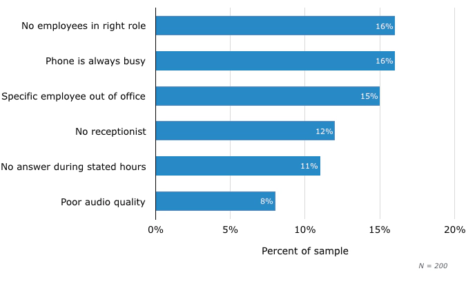 So take note - according to the survey, the top pain points in terms of inbound calls are all slightly related to one another in that they deal with the callers ability to reach the right employees. For example, respondents cited not being able to reach “an employee in the right role” as the joint top sore point along with the “phone always being busy”.