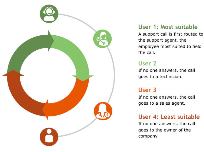 This process is often known as a waterfall call flow as the calls cascade through the group according to member appropriateness to answer the call starting with the most ideally suited before moving onto the next best person and finally finishing with the least suitable person as shown below: