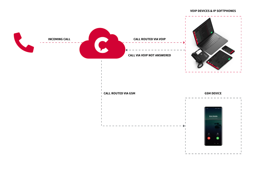 Der Anruf geht ein und die Telefonanlage versucht, den Anruf an Ihre Bürodurchwahl weiterzuleiten, indem die Telefonanlage zunächst die Ihrer Durchwahl zugewiesenen VoIP-Telefone anruft. Wenn die Telefonanlage keines Ihrer VoIP-Telefone erreichen kann, weil sie offline sind oder Sie nicht abheben, kann die Telefonanlage so konfiguriert werden, dass es den Anruf an Ihre GSM-Mobiltelefonnummer “weiterleitet”. Ihr Mobiltelefon klingelt dann wie ein normaler GSM-Anruf und Sie können weiter telefonieren. Damit dies funktioniert, muss die Telefonanlage natürlich Ihre Mobiltelefonnummer kennen.