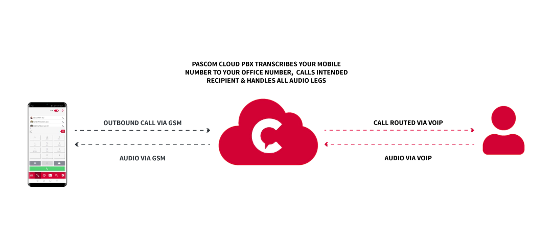 Werfen wir nun einen Blick auf ausgehende Anrufe. Dank mobiler VoIP-Anwendungen wird die Notwendigkeit, Geschäftsgespräche über GSM zu führen, immer geringer. Aber nehmen wir an, Sie haben keine WiFi-Verbindung und das mobile Internet ist nur begrenzt verfügbar. Dann können Sie, wie bei pascom, direkt in der App auswählen, dass Sie den Anruf über GSM tätigen. Wenn Sie die gewünschte Nummer wählen, ruft die App eine vorkonfigurierte Nummer an, welche auf dem Server der Telefonanlage für genau diesen Zweck eingerichtet wurde. Die Telefonanlage nimmt den Anruf entgegen, und gleichzeitig teilt die App der Telefonanlage mit, welche Nummer Sie anzurufen versuchen. Die Telefonanlage nutzt diese Information, um den Anruf an die gewünschte Nummer weiterzuleiten und gleichzeitig die Anrufer-ID Ihres Mobiltelefons in Ihre geschäftliche Rufnummer umzuwandeln.