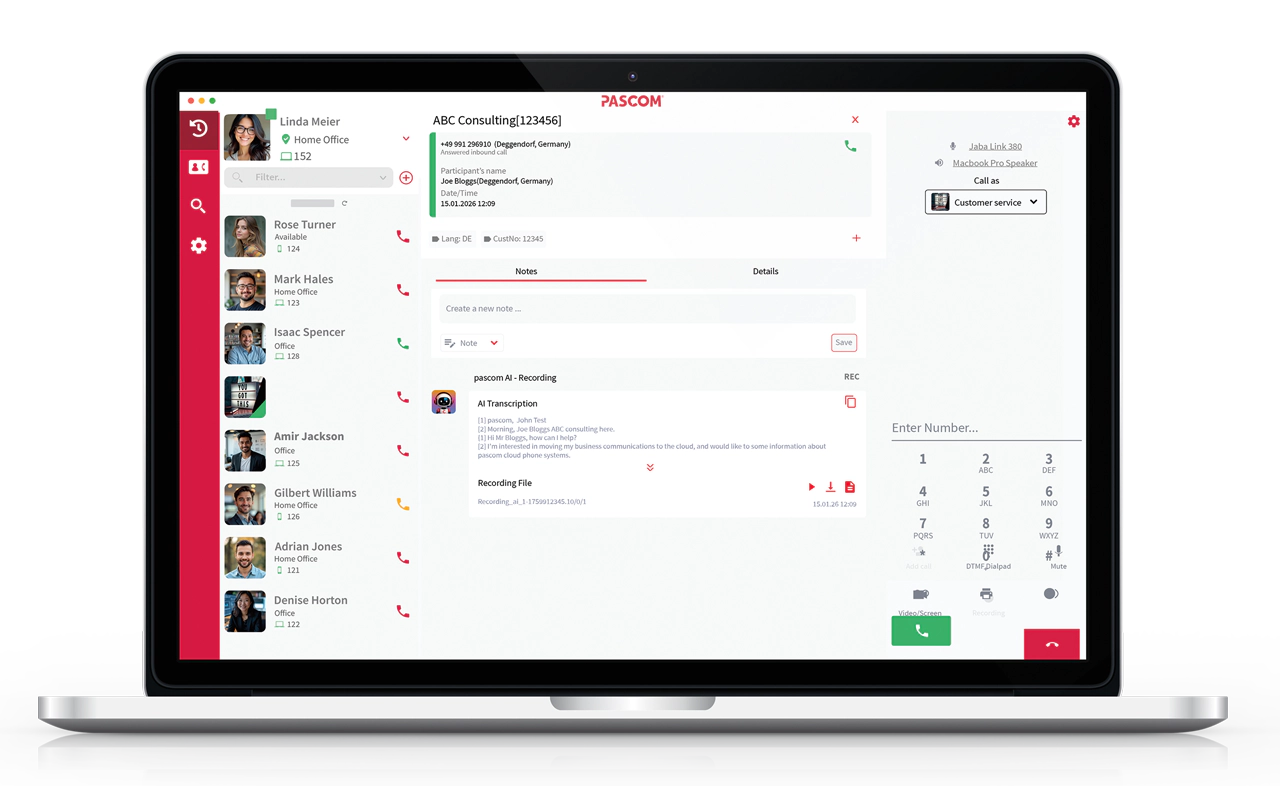 Die Transkriptionsfunktion von pascom nutzt automatische Spracherkennung (Automatic Speech Recognition, ASR) – eine KI-gestützte Speech-to-Text-Technologie (STT). Diese wandelt aufgezeichnete Telefongespräche in geschriebenen Text um. So lassen sich alle Details eines Telefonats mühelos erfassen. Unternehmen werden dabei unterstützt, das Kundenerlebnis zu optimieren, indem sie Muster in Kundeninteraktionen identifizieren und tiefere Einblicke gewinnen.