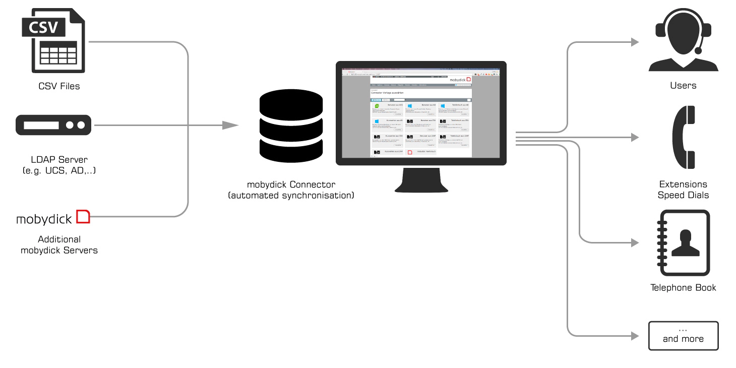 Das Jahr 2015 steht für uns im Zeichen der Integrationen. Nachdem wir ja bereits mit mobydick 7.09 eine neue SIP Provider Database entwickelt haben, mit der Sie spielend neue Provider in Ihre mobydick integrieren können, haben wir für 7.10 einen neuen mobydick Connector entwickelt. Der mobydick Connector synchronisiert externe Datenquellen in die mobydick. mobydick ist in der Lage eine Vielzahl von Objekten wie z.B. Telefonbücher, Benutzer, Kurzwahlen usw. zu importieren. Diese können entweder aus einer CSV-Textdatei, LDAP-Quellen oder einem anderen mobydick VoIP Telefonanlage Server importiert werden. Vermeiden Sie redundante Datensätze und sparen Sie Zeit und Geld dank der automatisierten Synchronisation aus Ihren externen Datenquellen.