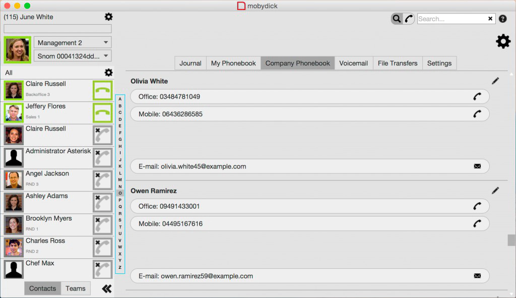 Wir haben auf Ihre Wünsche gehört und das mobydick Telefonbuch komplett überarbeitet. Das persönliche und Firmentelefonbuch steht nun als Liste zur Verfügung und kann komplett im Client verwaltet werden. Legen Sie Einträge noch während des laufenden Gespräches, aus Suchergebnissen oder aus dem Journal an.