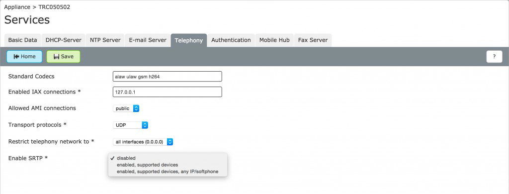 In einem neu hinzugekommenen Telefonie-Tab können Sie nun globale Einstellungen setzen. Besonders interessant ist hier die SRTP Verwaltung für unterstützte Geräte, welche Standardcodecs verwendet oder welche IAX und AMI Verbindungen erlaubt.