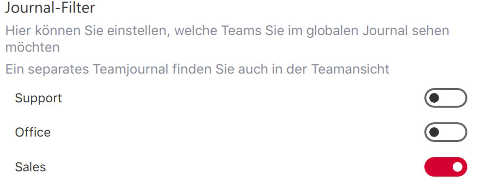 Im letzten Abschnitt des Filtermenüs werden schließlich alle Teams aufgelistet, in denen Sie Mitglied sind, und Sie können steuern, ob Anrufe über diese Teams in der globalen Anrufliste angezeigt werden sollen oder nicht: