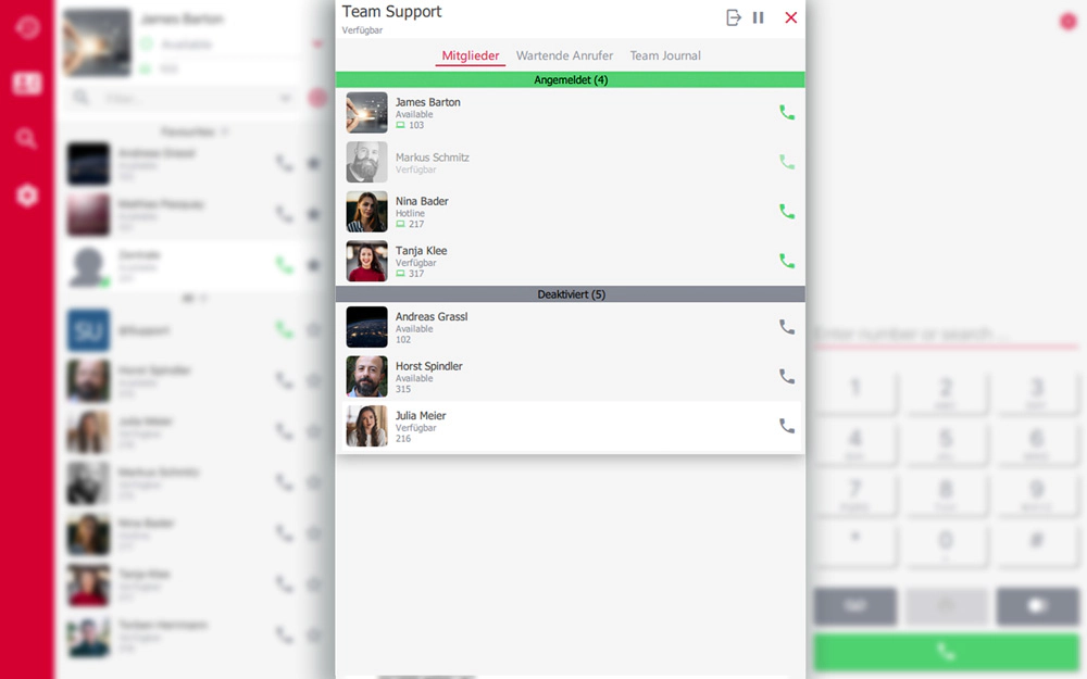 Innerhalb der Team-Übersicht haben Sie alle erforderlichen Werkzeuge, um die anderen Teammitglieder im Auge zu behalten. Sie sehen wer sich im Team an- und abgemeldet hat und können sich natürlich auch selbst einloggen. Überwachen Sie Wartende Anrufer und greifen Sie auf die Anrufhistorie für das Team zu.