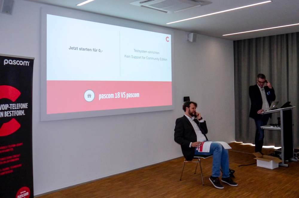 Nicht zu kurz kam die Vorstellung der neuen pascom Telefonanlage mit der pascom CEO Quirin Pasquay die Vertriebspartner bekanntmachte. Die neue Telefonanlage soll die aktuellen SOHO- und SMB-Angebote ersetzen, wird jedoch in derselben Preisklasse liegen wie ihre Vorgänger und bietet erhebliche Leistungs- und Stabilitätsverbesserungen.