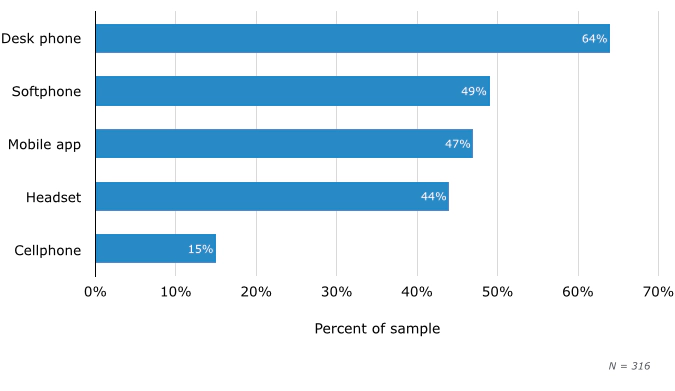 According to the survey, softphones are currently being used by nearly 50% of the respondents, which indicates that while the technology is slowing catching up with desktop phones, the preferred choice for employees who are office based (or remote workers when in the office) is the desktop phone.