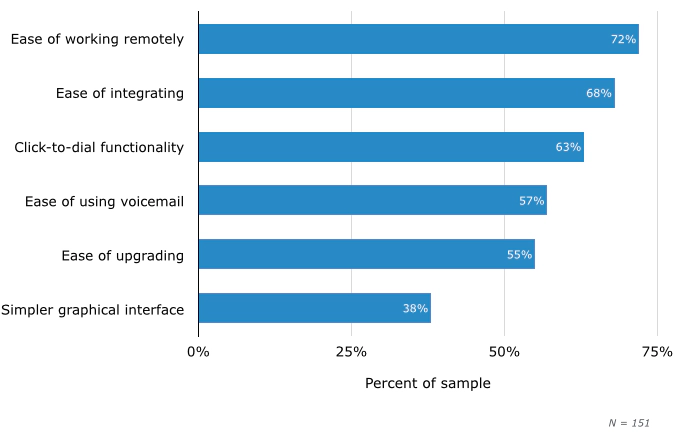 While desktop phones have managed to maintain first place, the question is for how much longer, as more and more companies employ BYOD strategies and promote teleworking, the adoption of technology such as softphones and mobile apps will continue to grow, as they promote greater flexibility whilst increasing availability of employees with integrated UC features. In fact, 72% of respondents said using softphones aided them by easing remote working.