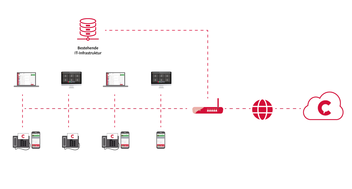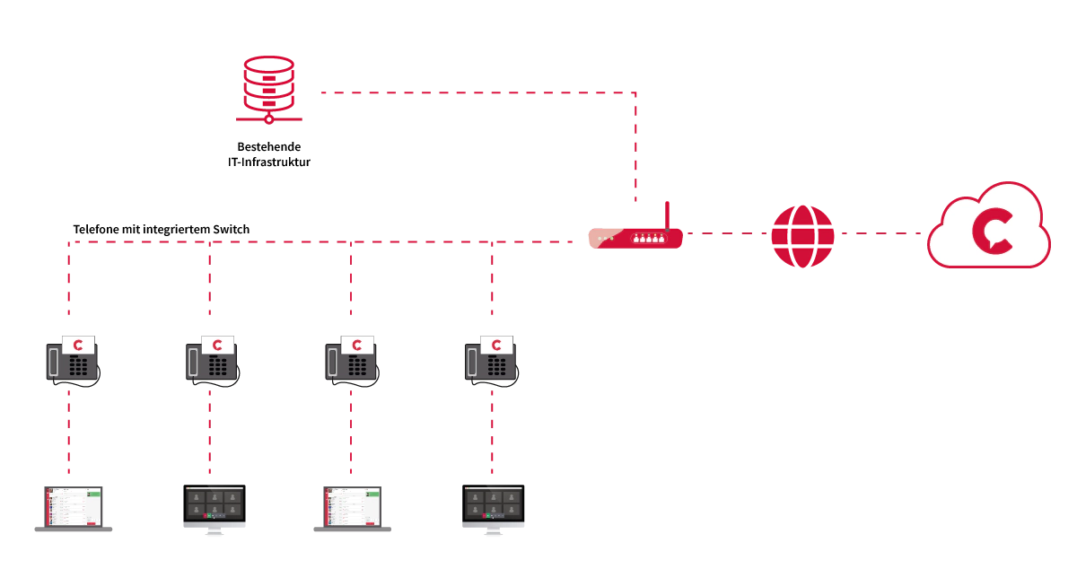 Die Netzwerkverkabelung bei einer Cloud-Lösung ist ähnlich wie bei einer Inhouse TK Anlage. Sie benötigen ebenfalls Switches für Ihre Endgeräte und einen Router. Jedoch sind nur geringe Anpassungen der vorhandenen IT-Umgebung erforderlich.