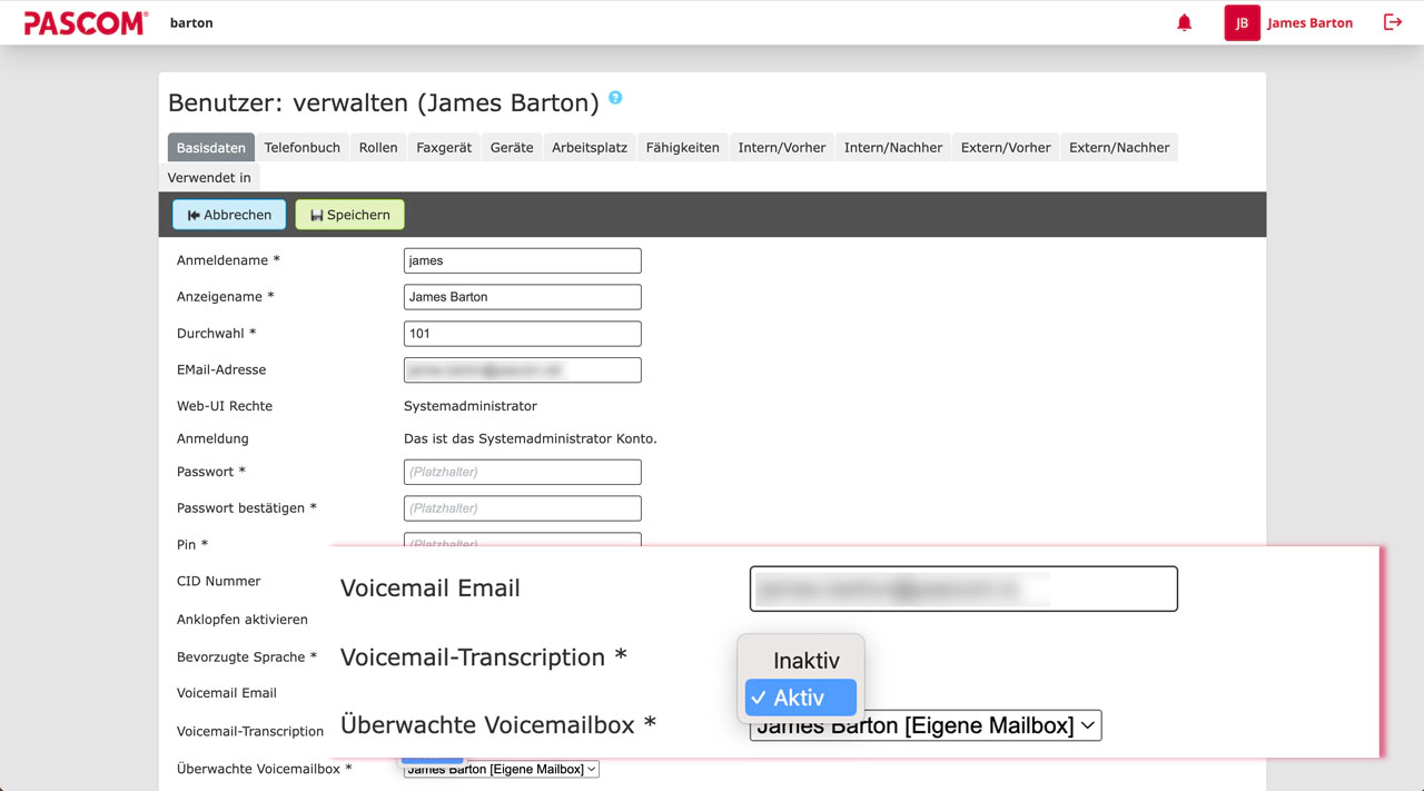 Als nächstes loggen Sie sich in die pascom Admin UI ein und wählen unter dem Menü Benutzer einen Benutzer und bearbeiten diesen. Unter dem Reiter Basisdaten scrollen Sie nach unten und aktivieren die Option Voicemail-Transkription.