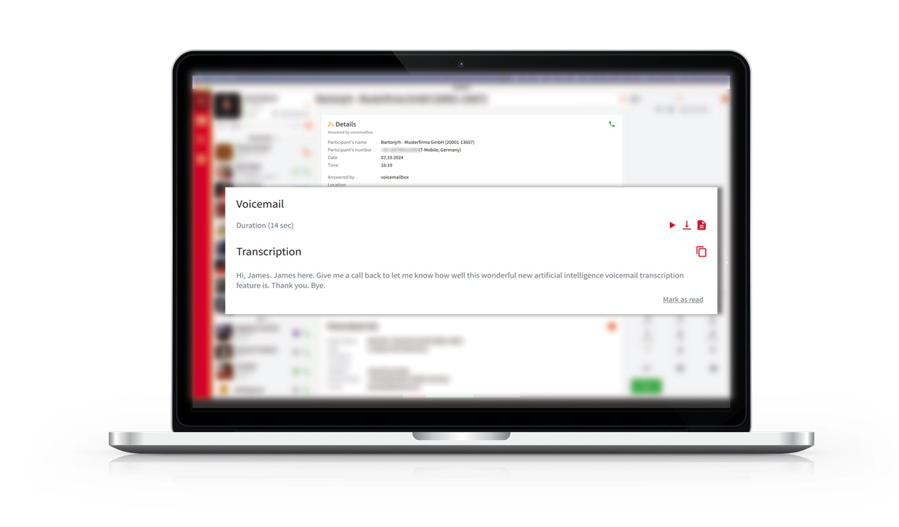 Sobald die Transkription der Sprachnachrichten aktiviert ist, transkribieren die pascom Apps automatisch Ihre Sprachnachrichten und fügen den Text an den entsprechenden Eintrag in der Anrufliste an:
